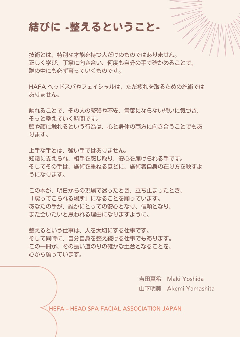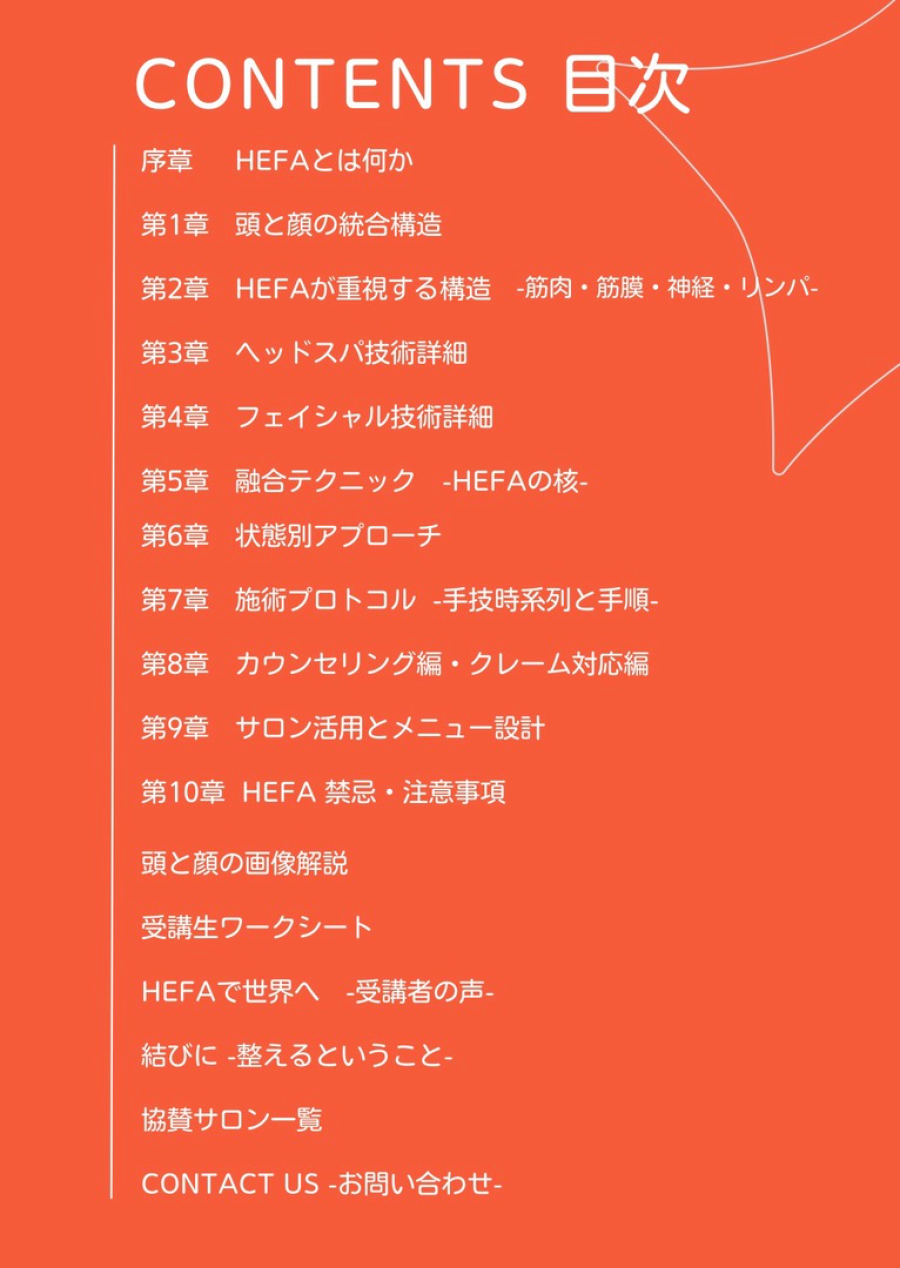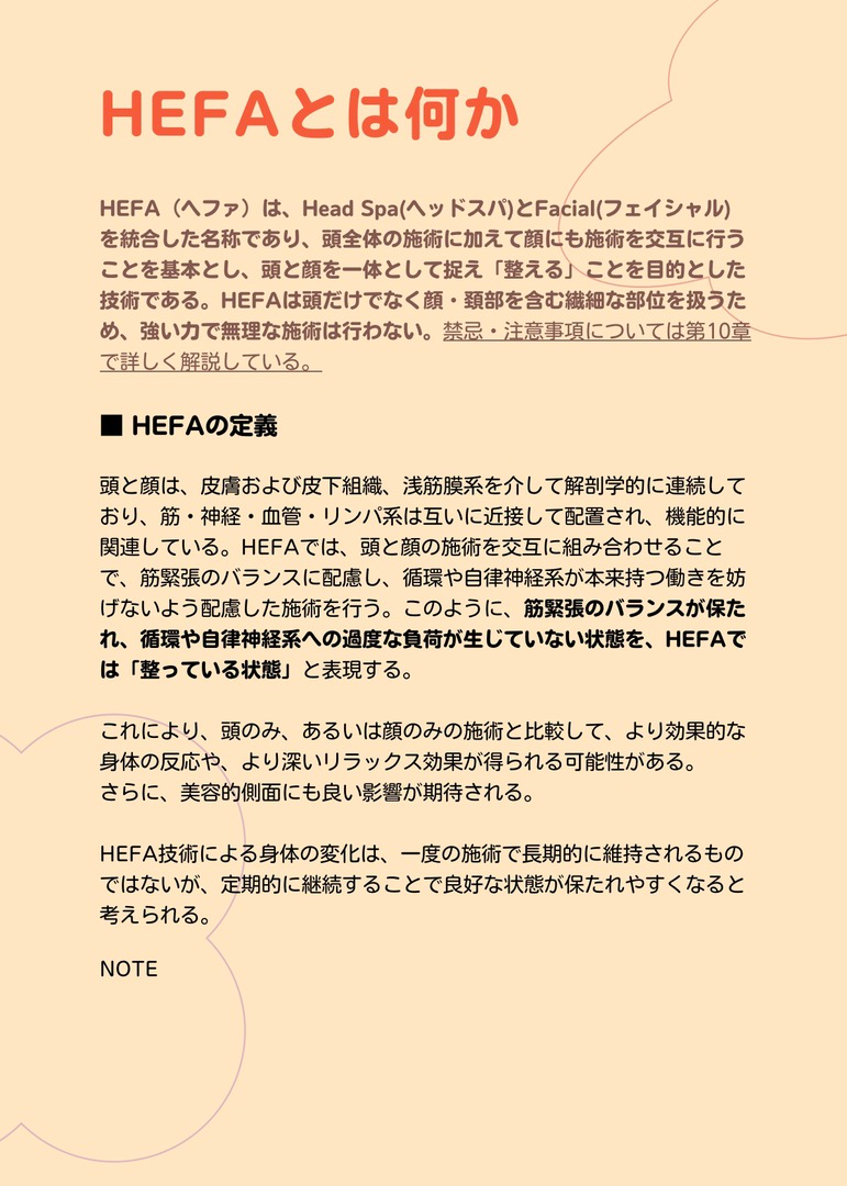 HEFAテキストブックは、頭と顔を一つのつながった構造として捉える施術の考え方と技術の基礎をまとめた教材です。