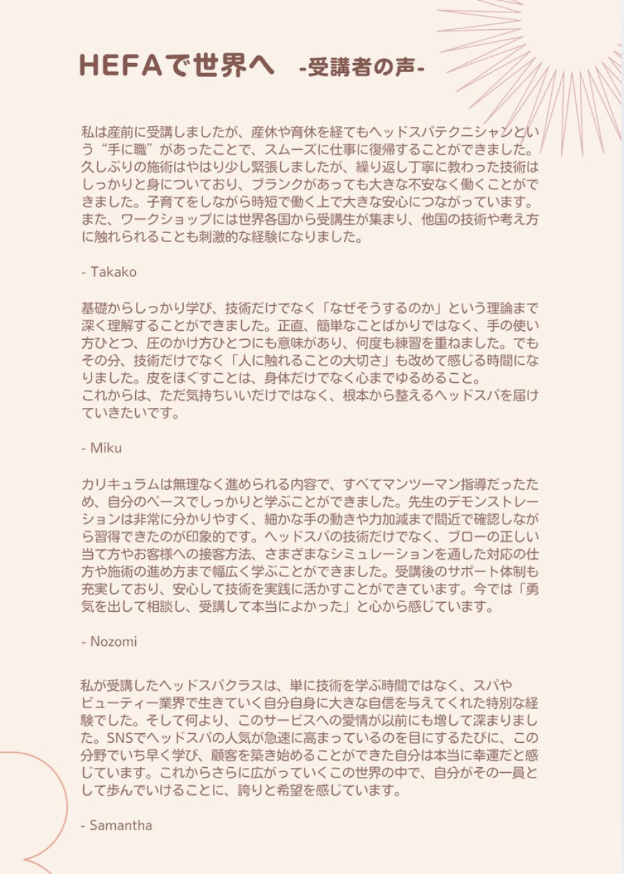 ヘッドスパやフェイシャルの技術を、感覚だけでなく構造的に理解できるよう、解剖の基礎や圧の考え方、施術の流れを分かりやすく整理しています。